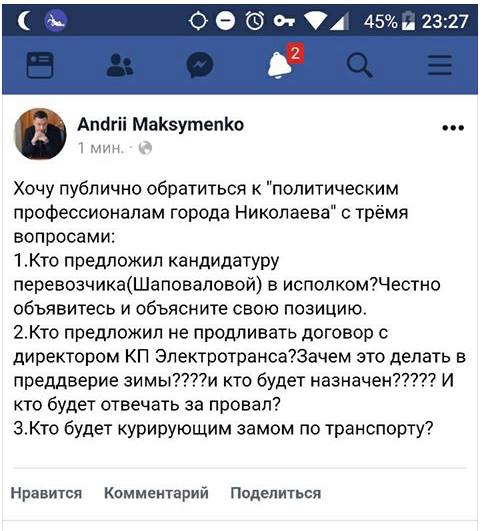 Начальник управления инфраструктуры Николаевской областной государственной администрации Андрей Максименко считает неправильным решение временно исполняющей обязанности Николаевского городского головы Татьяны Казаковой о внесении кандидатуры Инги Шаповаловой в состав исполкома Николаевского городского совета, а также отказ от продления договора с директором КП “Электротранс” Дмитрием Лисовским