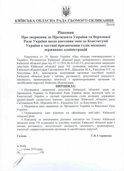 По инициативе депутатов фракции Оппозиционного блока Киевщины, ВО “Батькивщина» и других фракций сегодня, 28 января, на пленарном заседании внеочередной сессии Киевский областной совет принял обращение к Президенту Украины и Верховной Раде относительно внесения изменений в Конституцию Украины в части назначения глав местных государственных администраций путем проведения прямых выборов губернаторов.