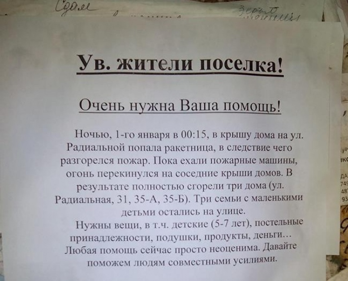 Жители Сахарного поселка, пострадавшие от пожара в новогоднюю ночь, нуждаются в самом необходимом. Соседи погорельцев собирают для них вещи, в том числе детские, постельные принадлежности, продукты питания, деньги.